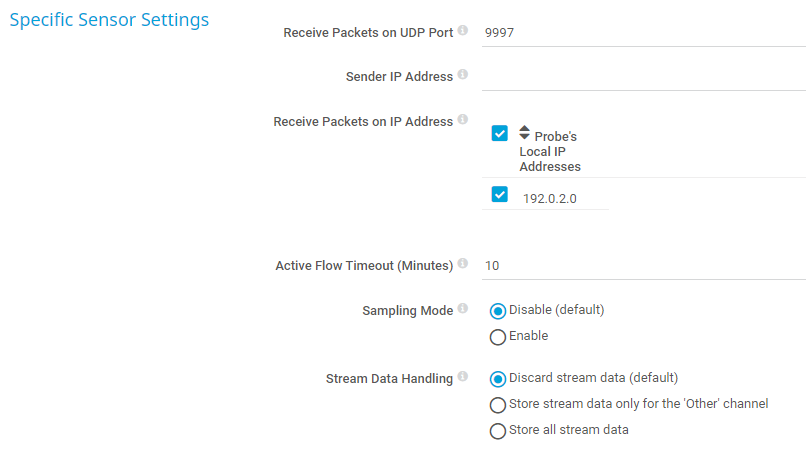 If the target device sends incorrect time information that results in wrong monitoring data, try to use 0 as the active flow timeout. This ignores the start and stop information of a flow as provided by the device and accounts all data to the current point in time. It might result in spikes but the sensor captures all data.